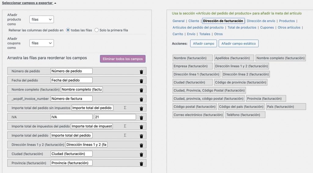 Una vez configuramos el filtro y el formato en el que queremos exportar los datos de los pedidos, tenemos que seleccionar los campos que queremos exportar los pedidos. Como el apartado anterior podemos exportar cualquier dato del pedido: