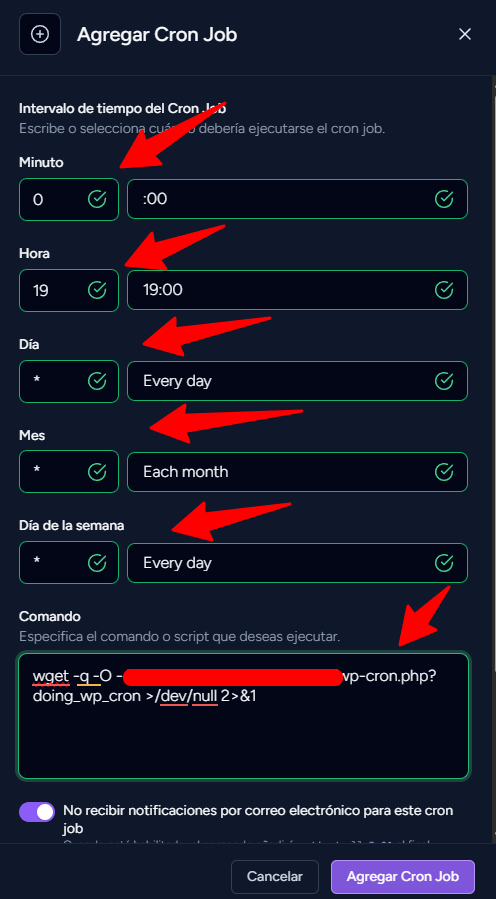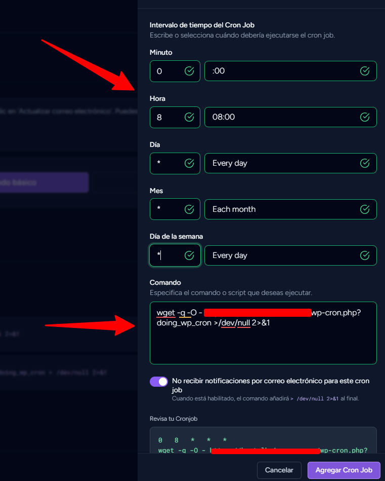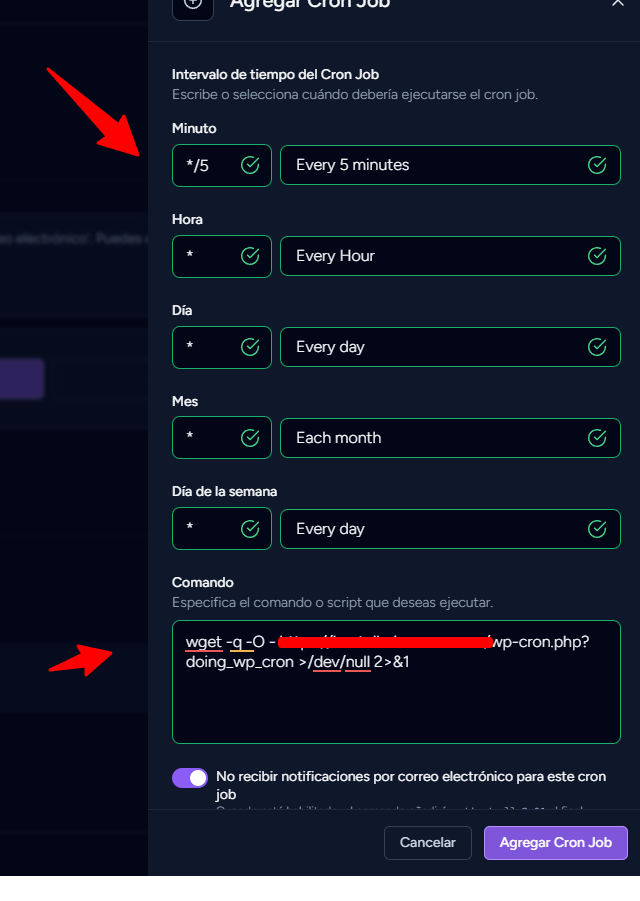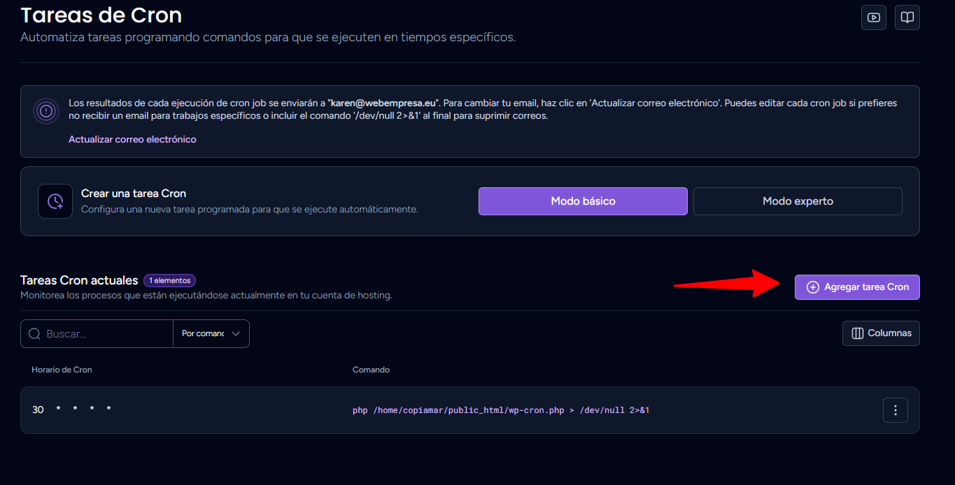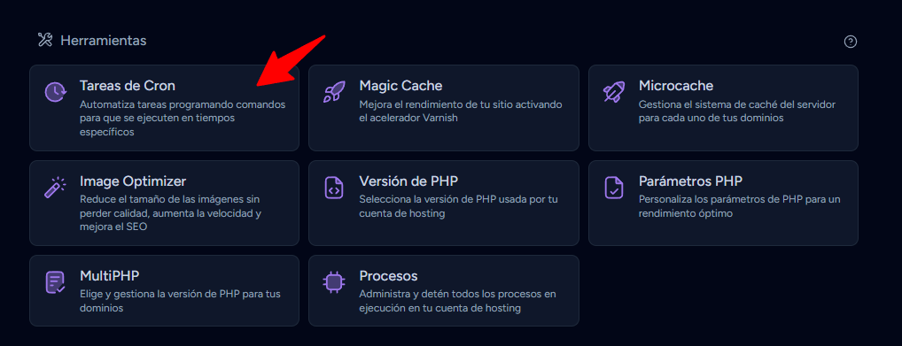 Para crear el cron en tu cuenta de hosting puedes acceder a tu wepanel → herramientas → tareas cron