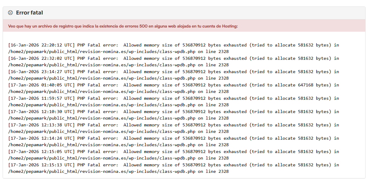 Ahora bien desde las herramientas que tenemos de analisis puedo percibir de que la memoria utilizada para ejecutar procesos en la web se ha visto desbordada, esto puede ocurrir por varios factores desde incompatibilidad de complementos, el tema activo en uso o el cargar recursos multimedia muy pesados