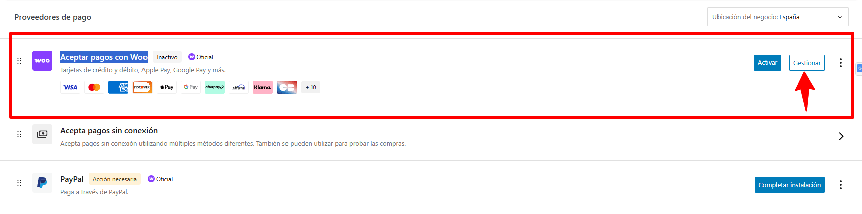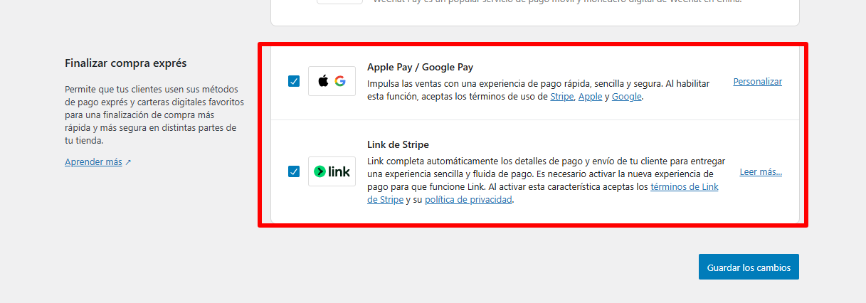Ten en cuenta que el método de stripe por sí solo también activa Google y Apple pay, si no quieres activarlo debes pulsar gestionar el método de pago stripe y desactivar la opción en sus ajustes