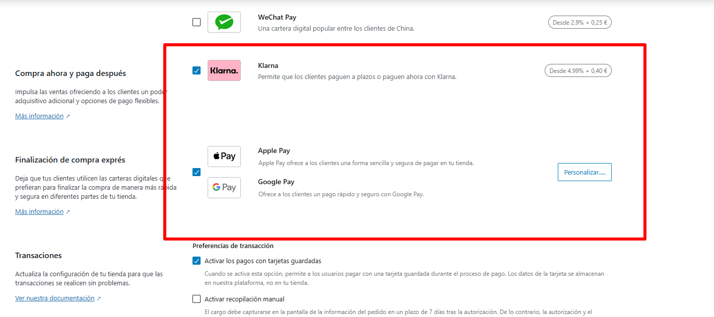 En cuanto al otro apartado, la única opción que desapareció fue "klarna". Siguen apareciendo "google play" y "pagar con link".