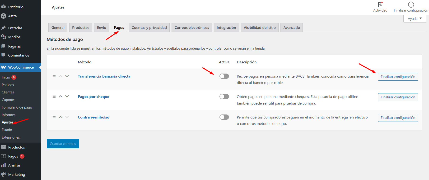 De forma nativa la opción esta disponible en WooCommerce, si consultas el apartado de WooCommerce -> Ajustes -> Pagos podrás ver que existe el método de pago "Transferencia bancaria directa"