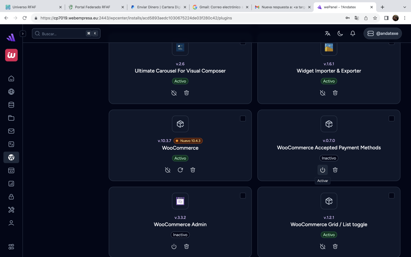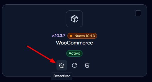 En el ejemplo que te comparto dfice WooCommerce pero tu en tu caso buscas el que te comparto arriba. Una vez hecho eso verifica si carga tu sitio con normalidad. Otra opcion e que ingreses a os archivos en Gestion de archivos en tu wepanel, luego ingresas en Public_html > wp-content > plugins, aqui buscas la carpeta con el nombre del plugin WooCommerce Accepted Payment Methods para cambiarle el nombre a por ejemplo WooCommerce Accepted Payment Methods2 de esta fortma no se carga en tu sitio y se ve como desactivado para que puedas ingresar al administrador.