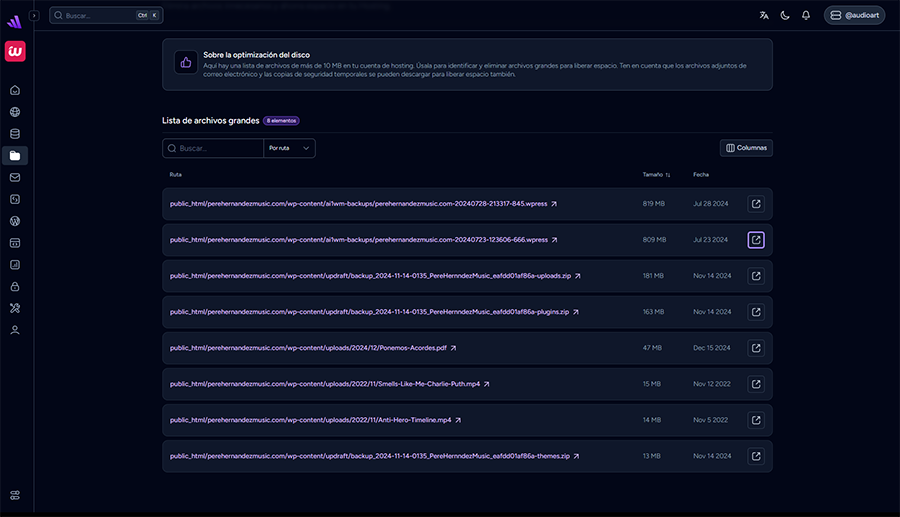 809 MB en el fichero /home2/audioart/public_html/perehernandezmusic.com/wp-content/ai1wm-backups/perehernandezmusic.com-20240723-123606-666.wpress