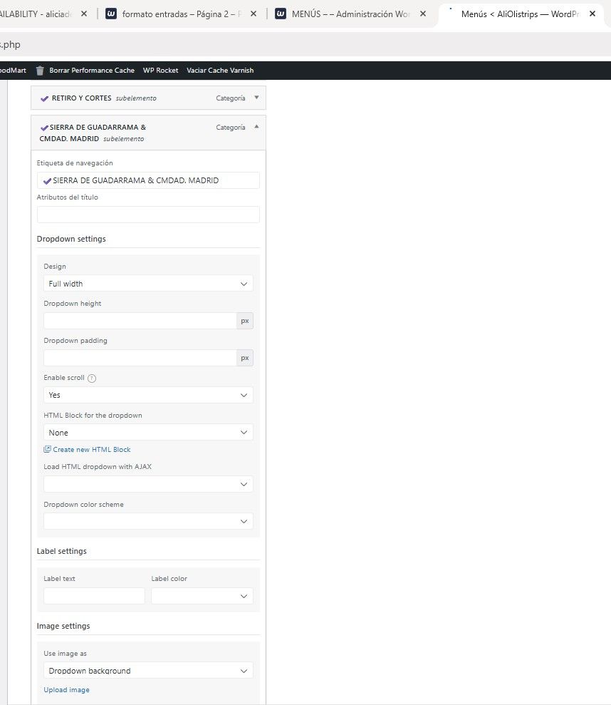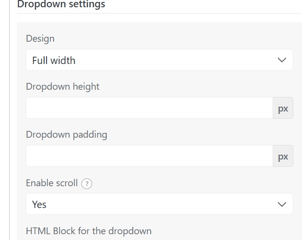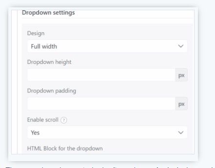 .- En Dropdown settings -> Design selecciona Full width