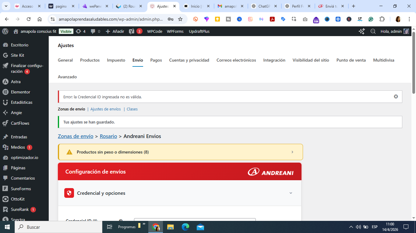 hola Argenis, estoy esperando comunicarme con Andreani dado que revisando lo que me decis, me di cuenta que la credencial que yo copiaba desde mi cuenta en Andreani pone luego de pegarla "credencial invalida". No he recibido respuesta aun de la empresa.