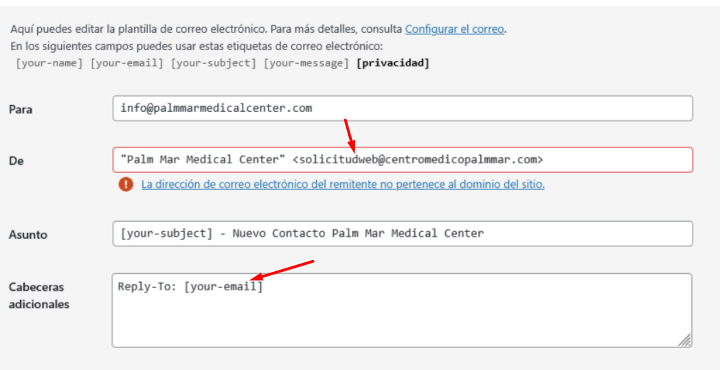 2- El correo de remitente o el que esta en el campo "De" debe ser un correo que haga match con el dominio del sitio web, asi que lo cambiaria a info@palmmarmedicalcenter.com