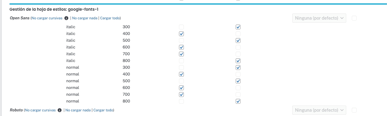 Marca las fuentes y variantes que utilizas en tu web ( creo que son Open Sans, Lato, Montserrat, Roboto y Roboto Slab ), selecciona cargar pronto, las demás selecciona No cargar