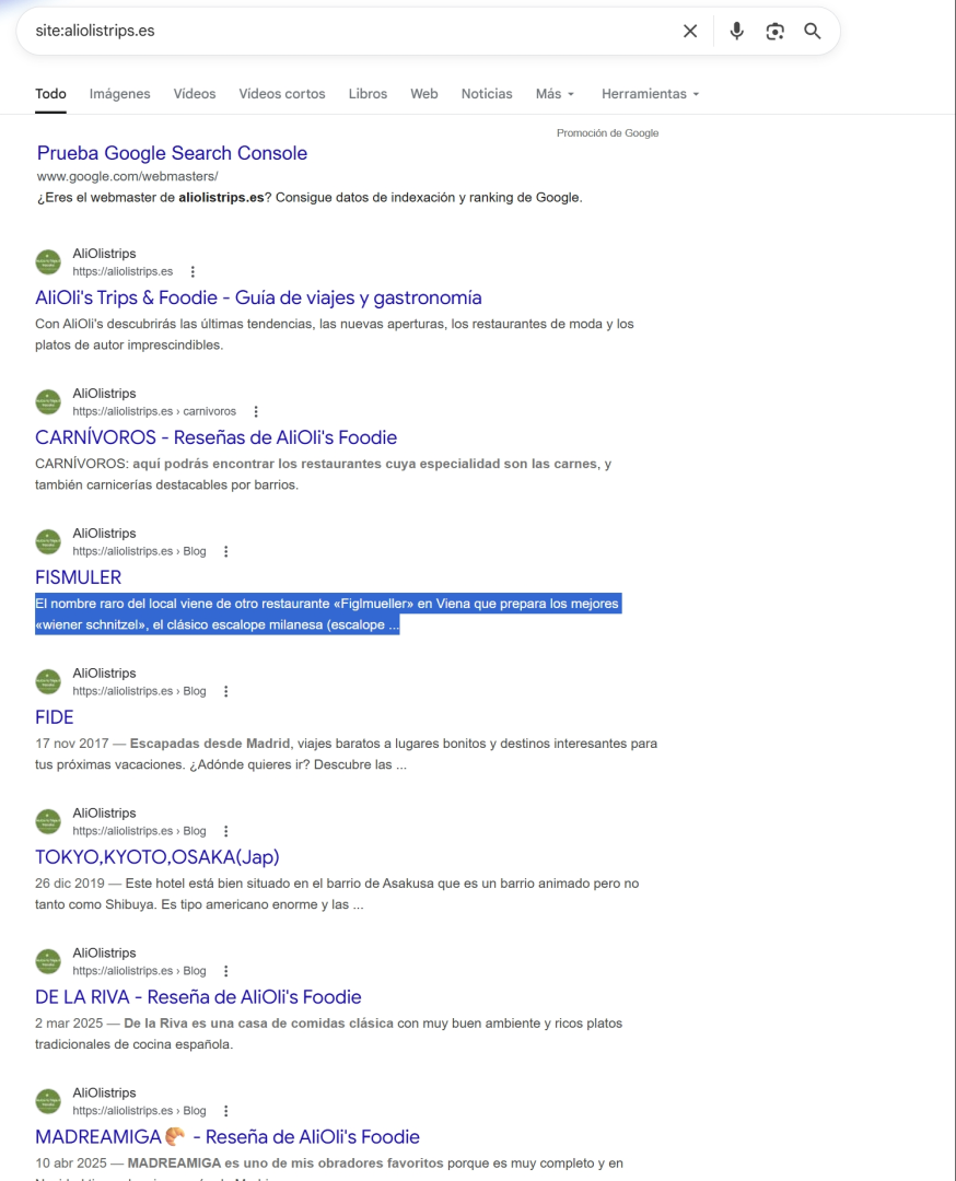 Sí, al buscar mi web, ya sé que aparece, pero lo que yo quiero que aparezca es cuando alguien busca un lugar, un restaurante, que mi review/reseña aparezca entre todas las demás. Y no aparece en ninguna de las páginas mostradas en la búsqueda.
