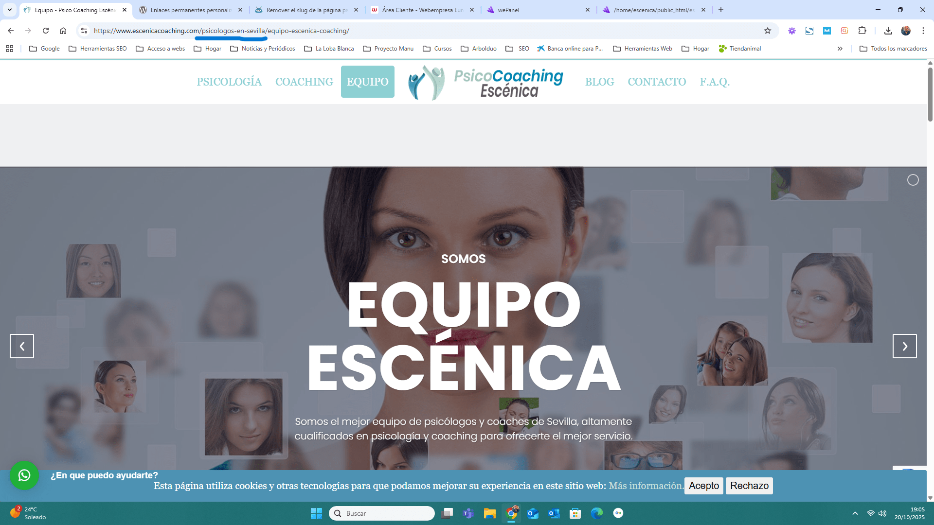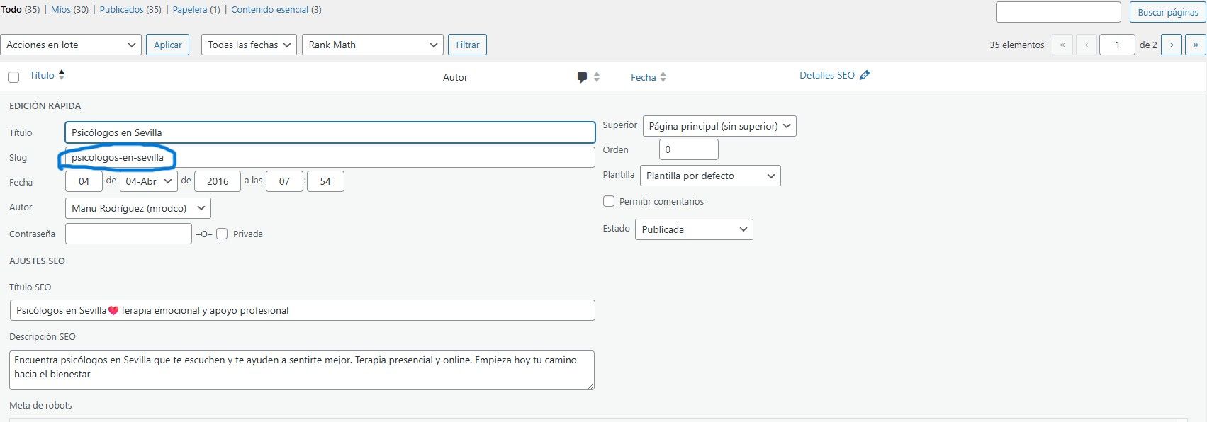 Buenos días y perdonad porque creo que no me explique bien. El permalink de mi home es www.escenicacoaching.com pero el slug es /psicologos- en-sevilla (primera de las imagenes). Si se accede a la home de mi web la url efectivamente coincide con el permalink www.escenicacoaching.com, pero cuando accedo a cualquier otra pagina, por ejemplo, la de coaching, su url es: https://www.escenicacoaching.com/ psicologos-en-sevilla/coaching-en-sevilla/ donde aparece delante de /coaching-en-sevilla el slug /psicologos-en-sevilla. Mi problema es que no puedo ni se como eliminar ese slug, ya que desde edicion rapida de la pagina de inicio no me deja, al borrarlo y actualizar la página, vuelve a aparecer.