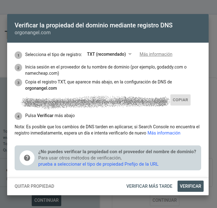 Estoy intentando verificar mi dominio en Google Search Console (GSC) usando el método DNS (registro TXT). Google me da una clave como esta:google-site-verification=estaEsLaClaveLargaQueMeDaGoogle1234567890abcdef