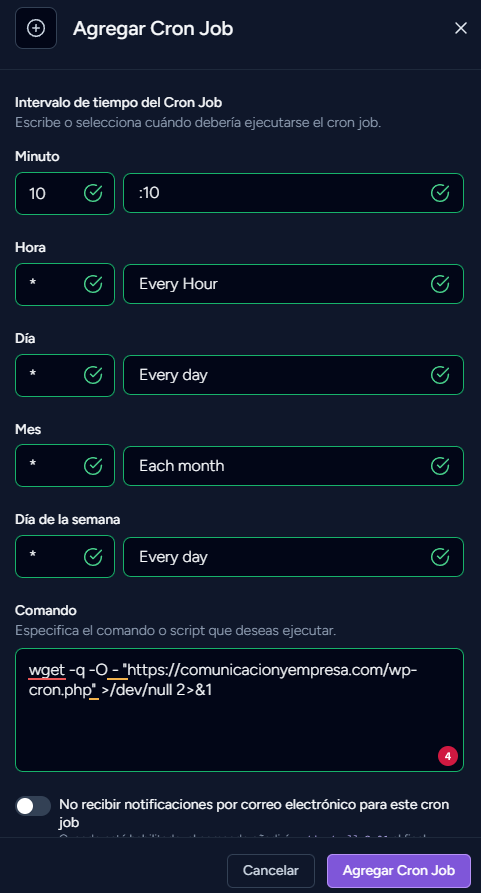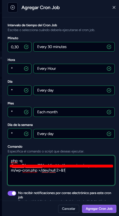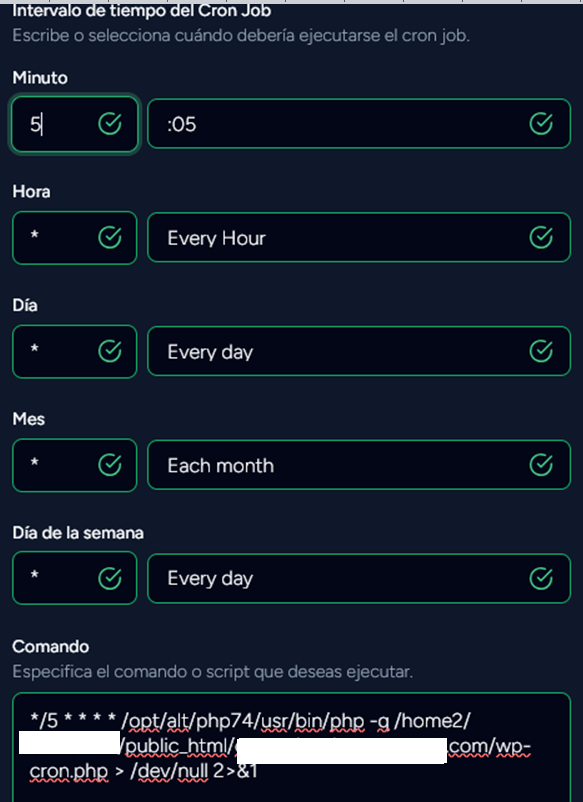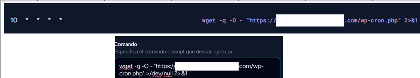 3) En WePanel ejecutar indicando mi dominio: wget -q -O - https://dominio.com/ wp-cron.php?doing_wp_cron >/dev/null 2>&1
