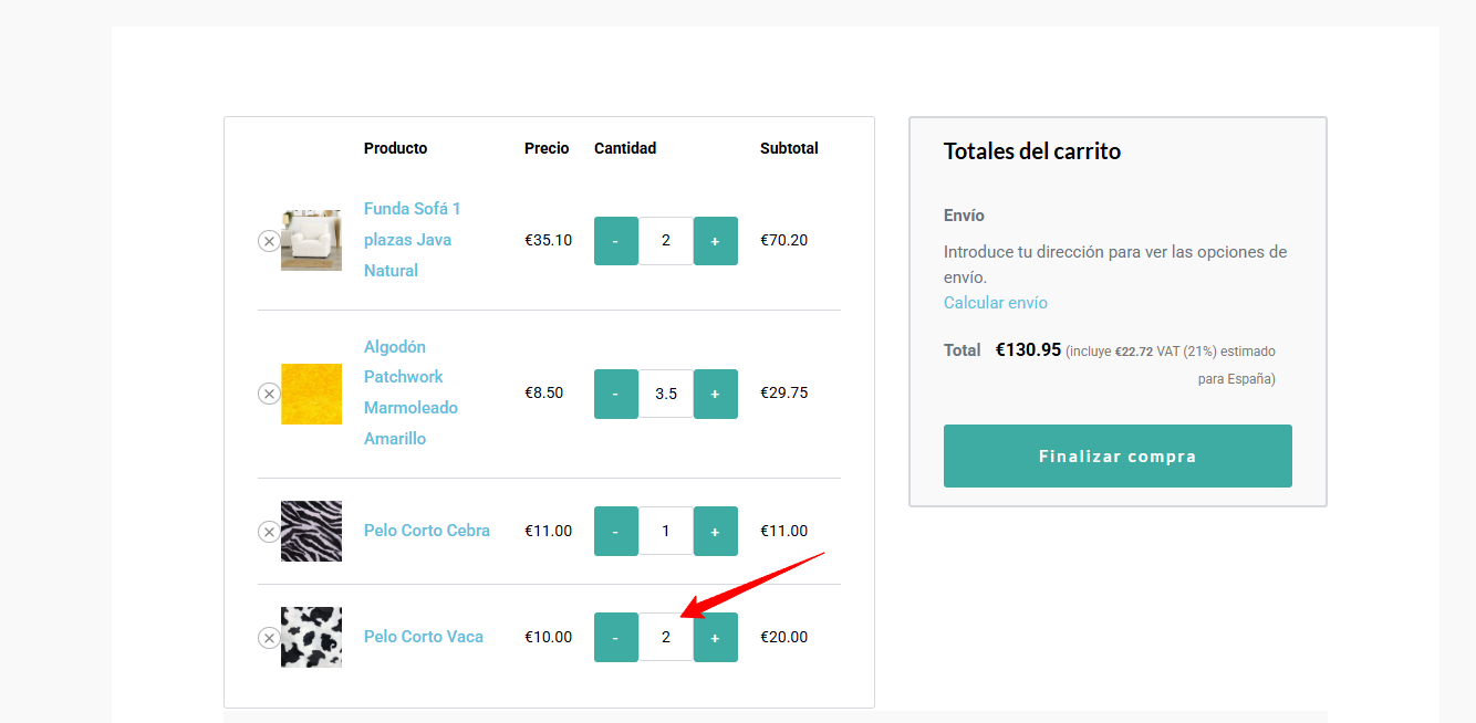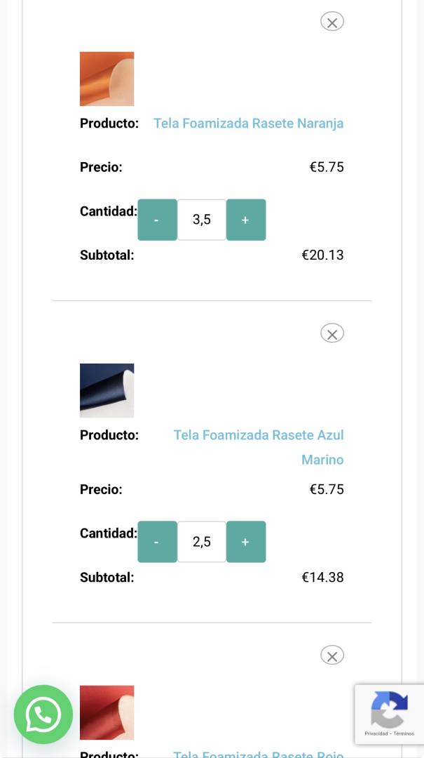 Cuando añado productos al carrito, al pichar en la opción ver carrito, en la nueva lista que aparece me añade cantidades a la lista. Por ejemplo si pongo 2 metros de tela foamizada roja, 3 de tela naranja, 2 de tela foamizada blanca y 2 de tela azul marino, en total 9 metros de productos, al pichar en ver carrito me pone por ejemplo... Pongo fotos: en la primera foto son las cantidades que yo he añadido bien. Y en la siguiente foto las que se cambian ellas solas al pichar en ver carrito y se ponen mal.
