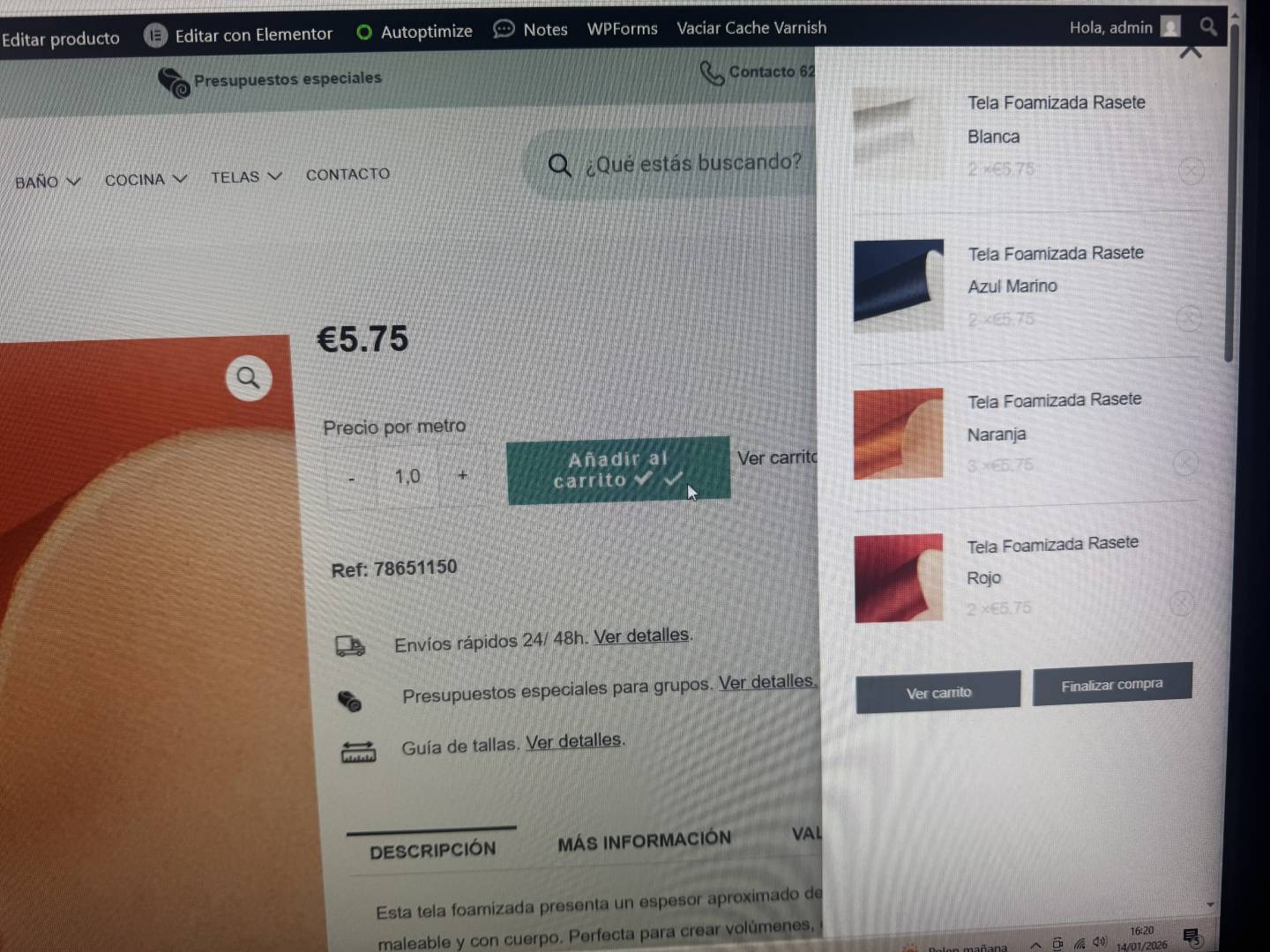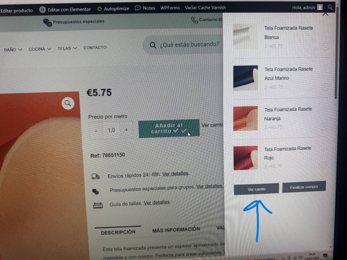 En esta foto se ve como por ejemplo en la tela naranja yo había puesto en el carrito 3 metros, y al pinchar en el botón ver carrito, no me ha mostrado los artículos con la misma cantidad sino que me ha añadido cantidades de manera errónea.
