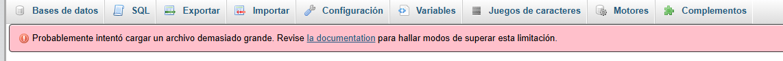 No puedo importar la base de datos. (Probablemente intentó cargar un archivo demasiado grande. Revise la documentation para hallar modos de superar esta limitación.)