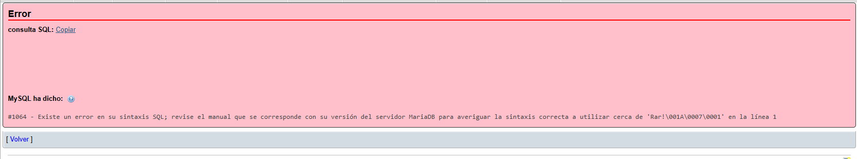 #1064 - Existe un error en su sintaxis SQL; revise el manual que se corresponde con su versión del servidor MariaDB para averiguar la sintaxis correcta a utilizar cerca de 'Rar!\001A\0007\0001' en la línea 1