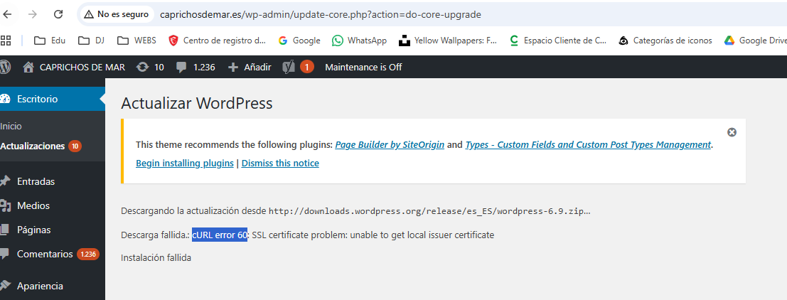Estoy intentado actualizar las instalaciones wordpress que tengo en mi hosting (www.asegesasesores.es , www.caprichosdemar.es y www.ongporunpasitomas.org) la primera al no tener el dominio anterior (al cliente se le pasó renovarlo y lo perdió) no puedo acceder a panel de wordpress, en los otros dos he intentado seguir los pasos en otros hilos con el mismo problema...lo primero que hice fue volver a una version anterior de Php como me dijeron los compañeros, a continuación he descargado el fichero y lo he subido a la carpeta a la carpeta "certificate" lo he descomprimido pero al ir a actualizar wordpress en www.caprichosdemar.es o www.ongporunpasitomas.org me da el error que os adjunto.