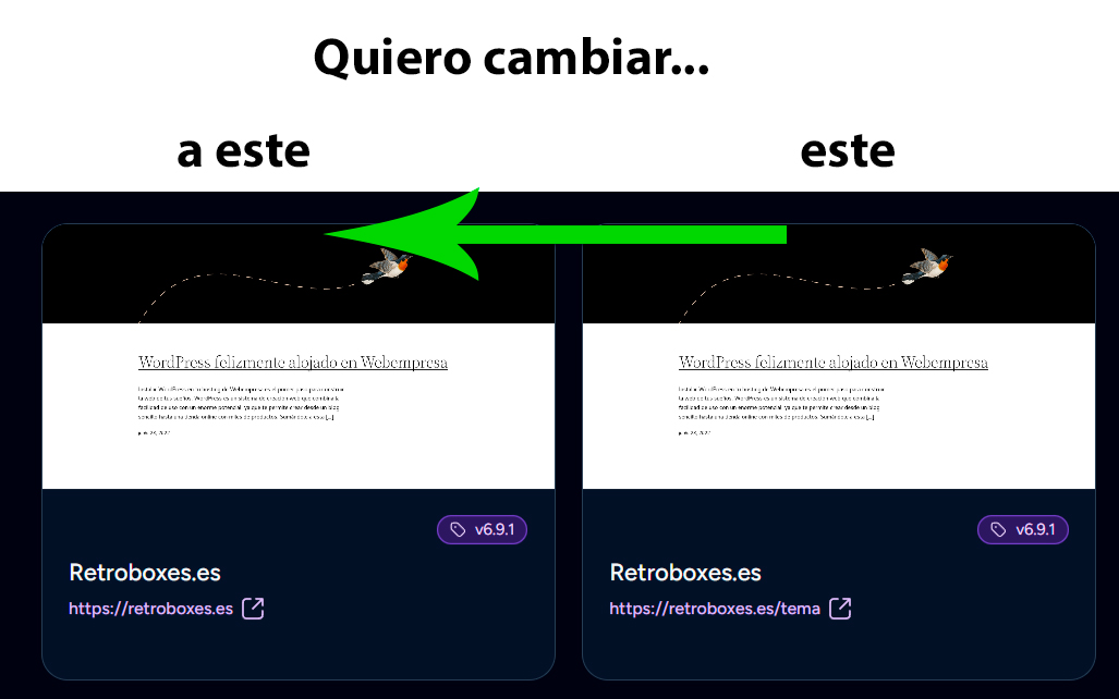Buenas tardes, he terminado con el clon de pruebas, he instalado el tema Generatepress Pro, he eliminado y sustituido muchos plugins, la web va como un tiro, he realizado compras de prueba y lo mas importante he actualizado a PHP 8.2 sin problemas. Y mi pregunta es ¿Cómo puedo pasar el clon retroboxes.es/tema (clon) directamente a retroboxes.es desde wepanel? Ya que tengo que realizar los cambios en 4 webs, si me evito una mejor que mejor. ¿Es esto posible?