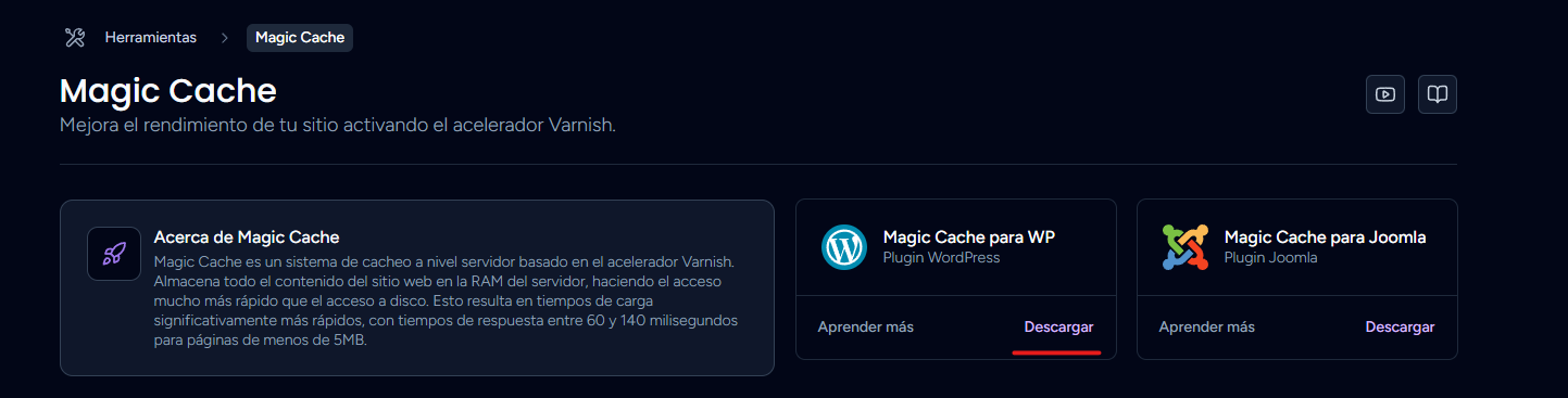 Una vez instalado configuralo de acuerdo a las indicaciones de la guia que tenemos disponible → https://guias.webempresa.com/preguntas-frecuentes/magic-cache/ y limpiar la cache de magic cache.