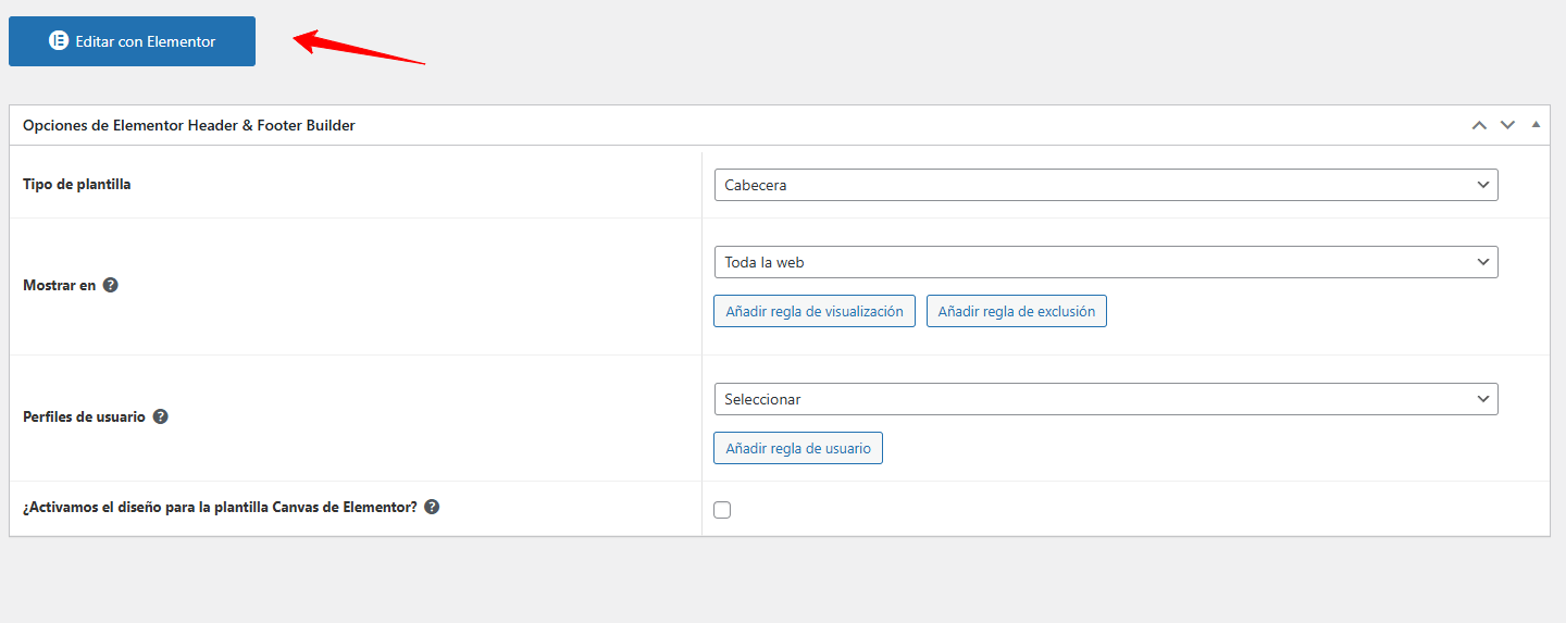 Una vez guardada la cabecera solo tienes que editar con elementor en el boton que vez en la imagen y comenzar a añadir los elementor de tu nueva cabera.