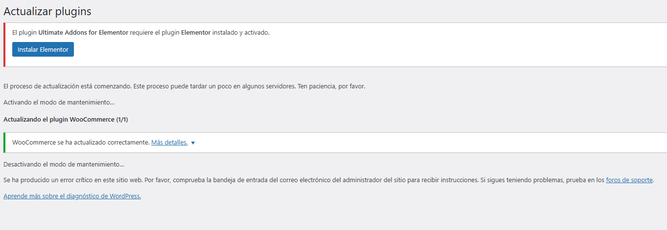 "Se ha producido un error crítico en este sitio web. Por favor, comprueba la bandeja de entrada del correo electrónico del administrador del sitio para recibir instrucciones. Si sigues teniendo problemas, prueba en los foros de soporte.