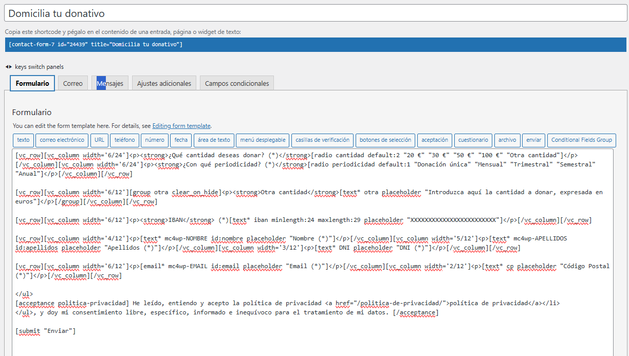 He creado un nuevo item de menú que se llama "Domicilia tu donativo" en el menú "Colabora" que está conectado a un formulario de "Contact Form" pero cuando rellena todos los datos no envía el formulario. Dice "No se ha podido enviar su mensaje. Por favor, pruebe de nuevo más tarde" y no encuentro el problema. Adjunto imagen con el código a ver si veis algo que falta o esté erróneo.