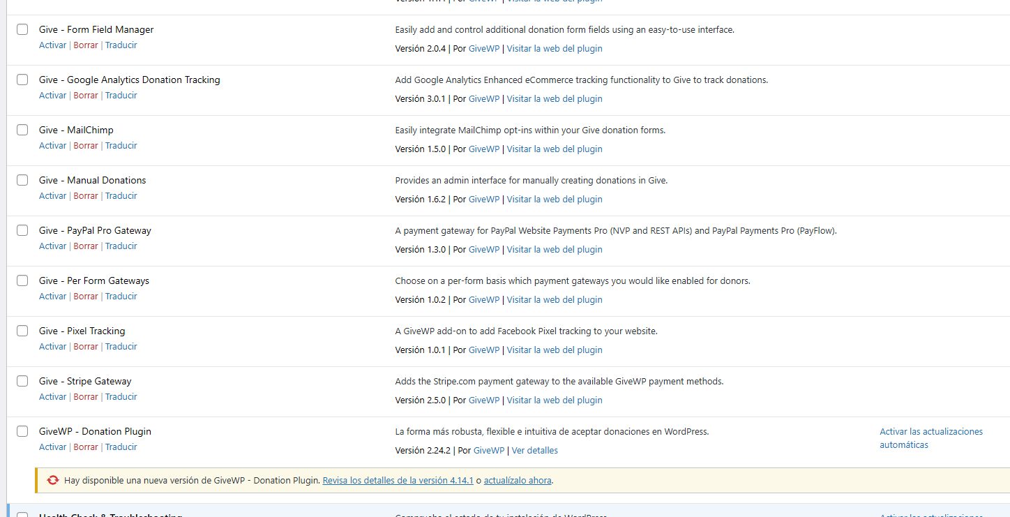.- Desactiva el plugin Give - Form Field Manager ( los plugins de Give son de pago y necesitas la licencia para poder actualizarlos )