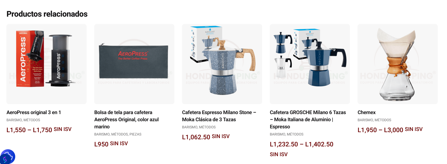 Por ejemplo, la marca AeroPress cuenta con varios productos como: AeroPress Go, AeroPress Original y Bolsa AeroPress. Nuestra intención es que, al ingresar a un producto específico (por ejemplo AeroPress Go), en la sección de productos relacionados se muestren automáticamente los demás productos de la misma marca.
