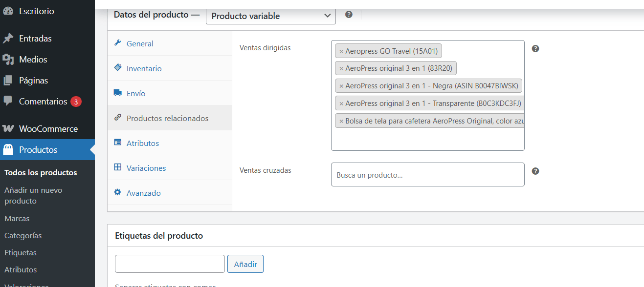 Ese paso ya fue ejecutado correctamente en los productos. En la sección de Productos relacionados se realizaron pruebas específicamente con los productos de AeroPress, con el objetivo de validar si cumplía con lo que necesitamos; sin embargo, el resultado no fue el esperado.