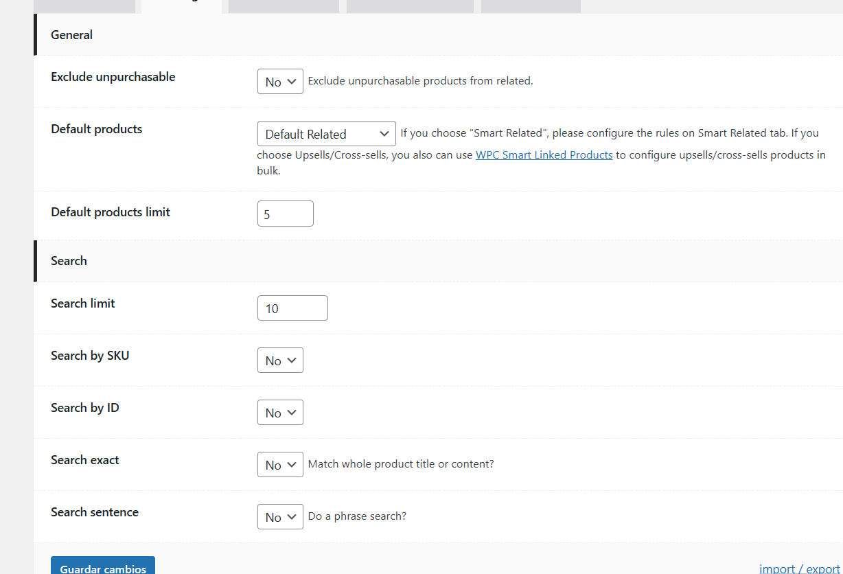 Entre sus opciones permite configurar productos especificos como relacionados