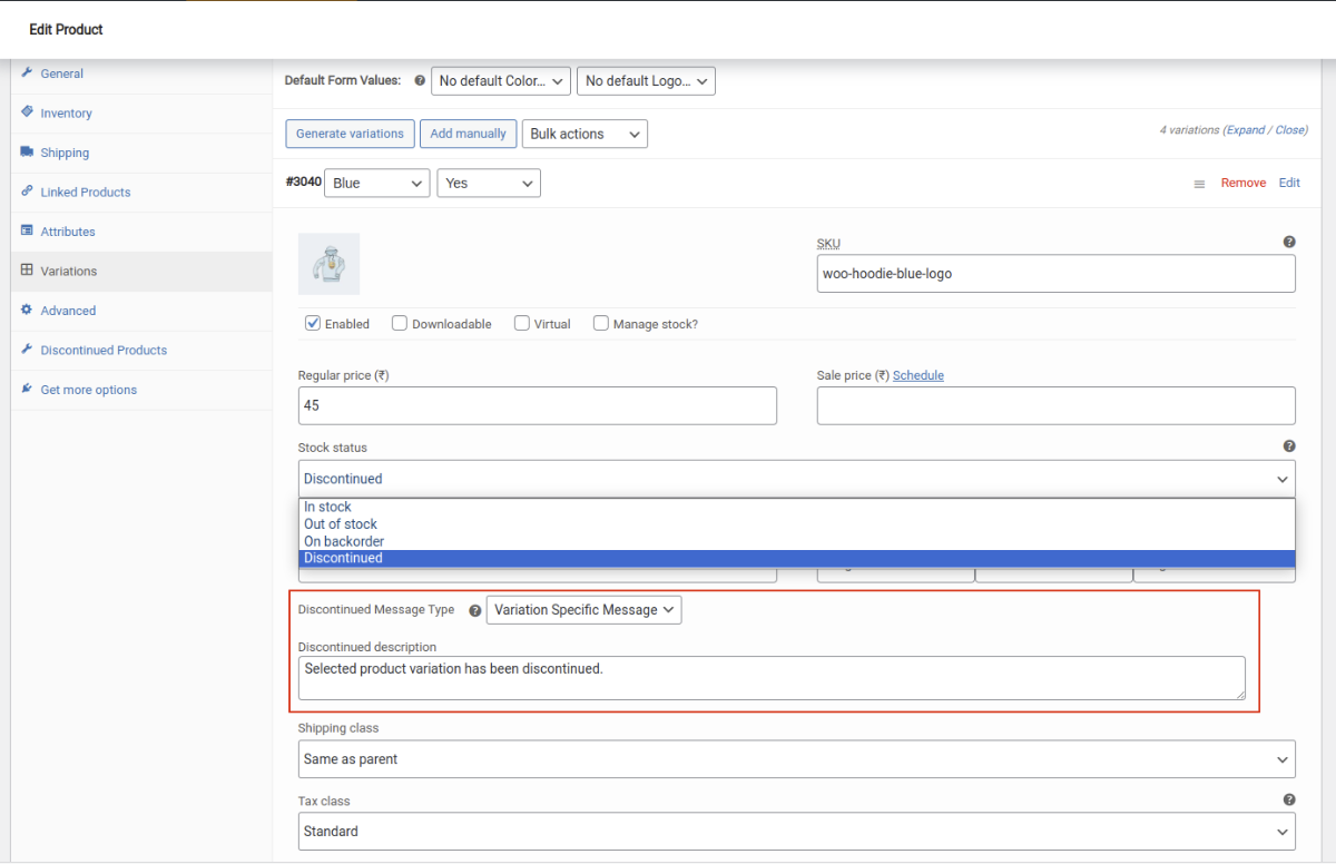He encontrado éste " https://es.wordpress.org/plugins/discontinued-product-stock-status-woocommerce/ " y según indica en captura de pantalla que adjunto, si incluye las variaciones; pero da errores "graves" al activar.