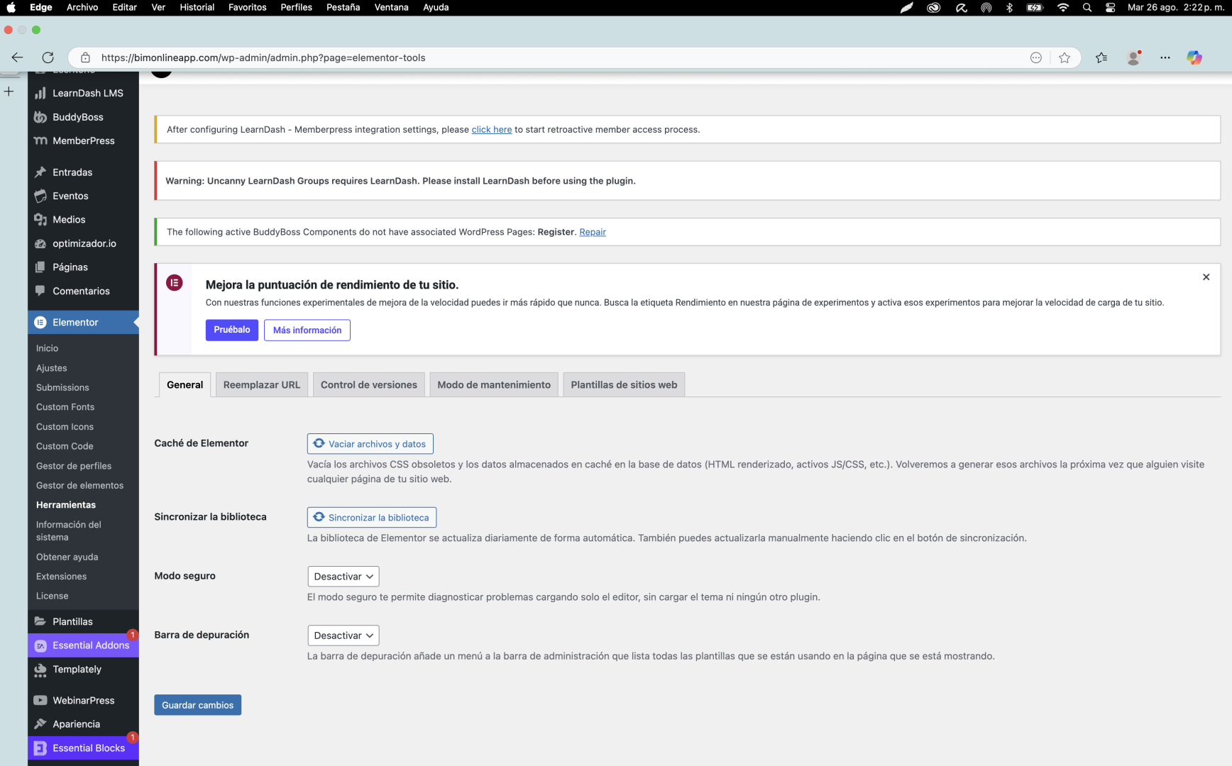 Habia creado un clon para cambiar el diseño de mi web construida con Elementor y Buddy boss.