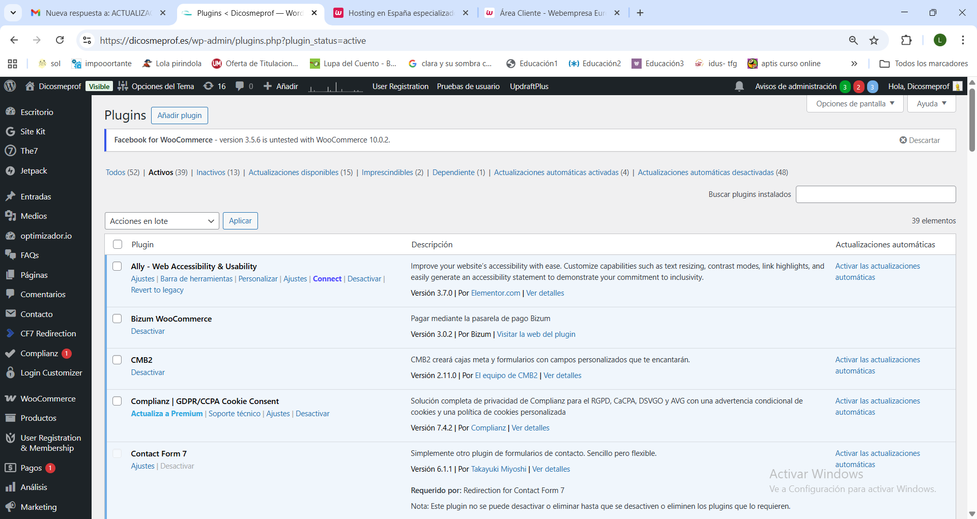 En mi web cuando voy a actualizar los plugins me aparece la siguiente imagen que adjunto. Cuando hago click en "2 extensiones" me saca fuera de la web, como a un error, imagen que adjunto más abajo en el mismo documento. ¿Pueden indicarme que debo hacer?