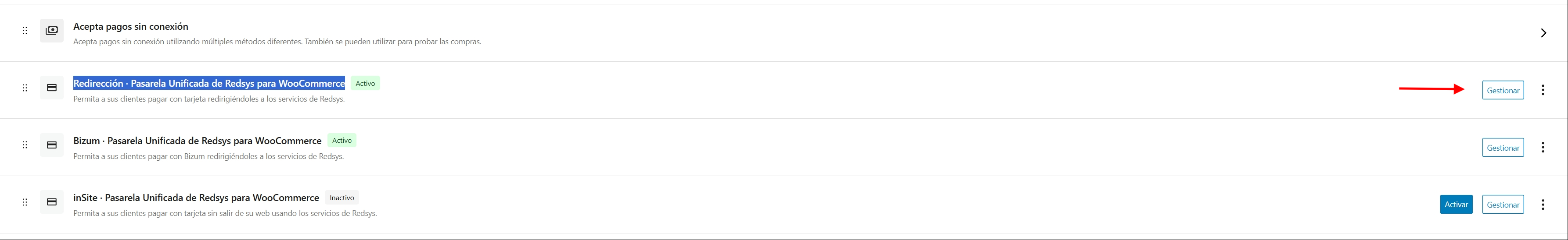 .- Pulsa Gestionar en Redirección · Pasarela Unificada de Redsys para WooCommerce