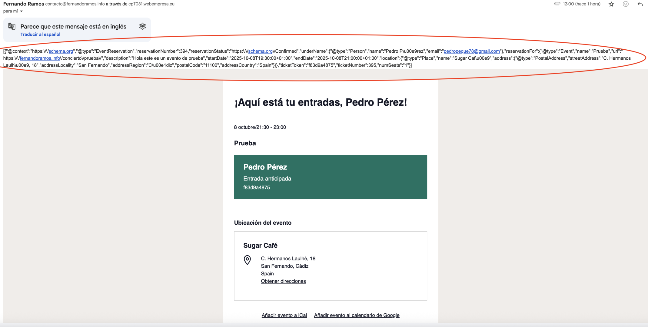 En los emails que envían los plugins Event tickets y The events calendar aparecen datos estructurados entre la cabecera y el cuerpo de los mismos, como pueden ver en la captura de pantalla adjunta.