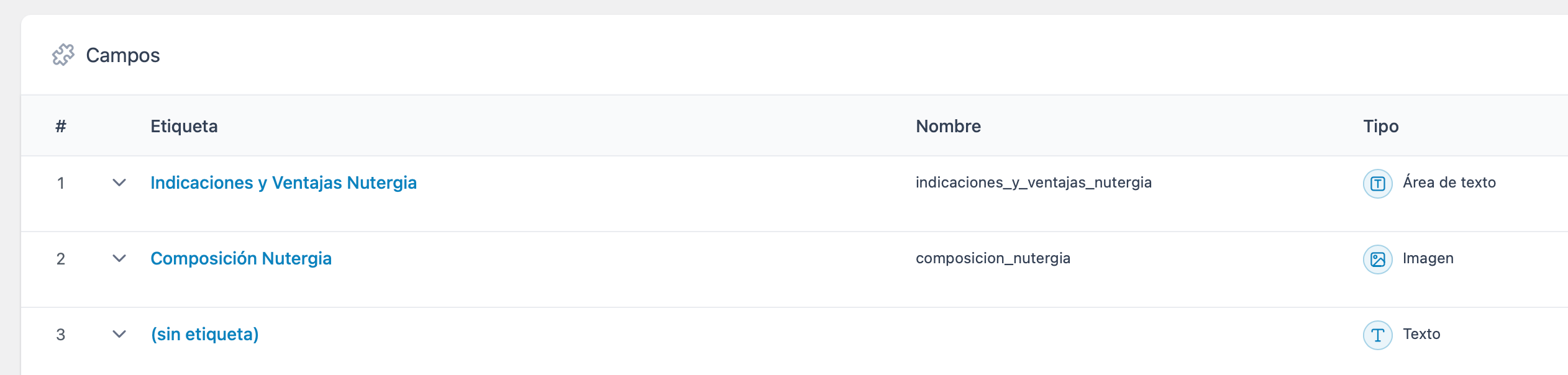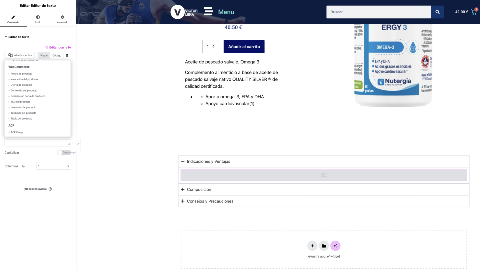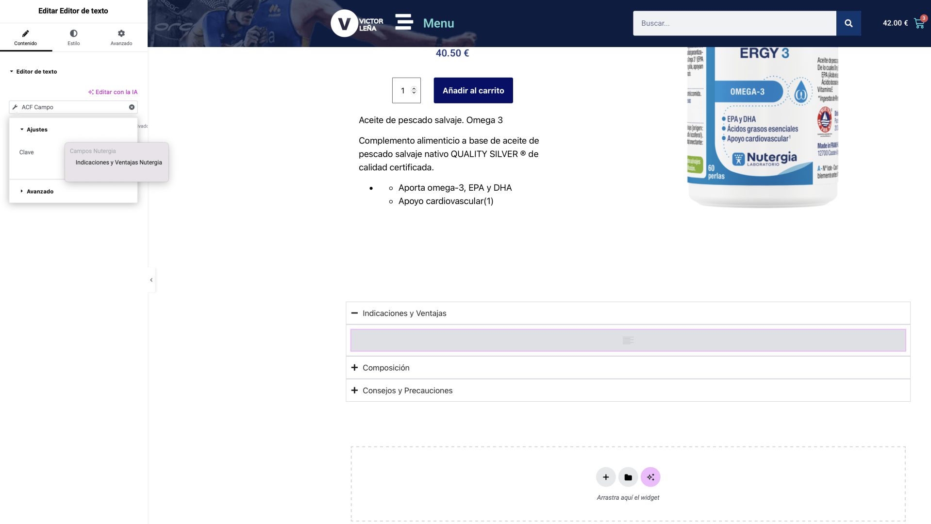 @karen Claro que si. Paso 1 creas el campo en ACF (adjunto captura). Luego completas la información dentro del producto (captura: se ve que escribo "texto de prueba"). Luego en elementor, en el diseño añades el Campo ACF al widget " Campo de TExto" (adjunto captura). Donde en campos dinámicos seleccionas el de texto, y ahí aparece el campo dinámico creado. Pero al seleccionar no se ve nada. No toma la información del campo creado y rellenado en el producto. Muchas gracias...
