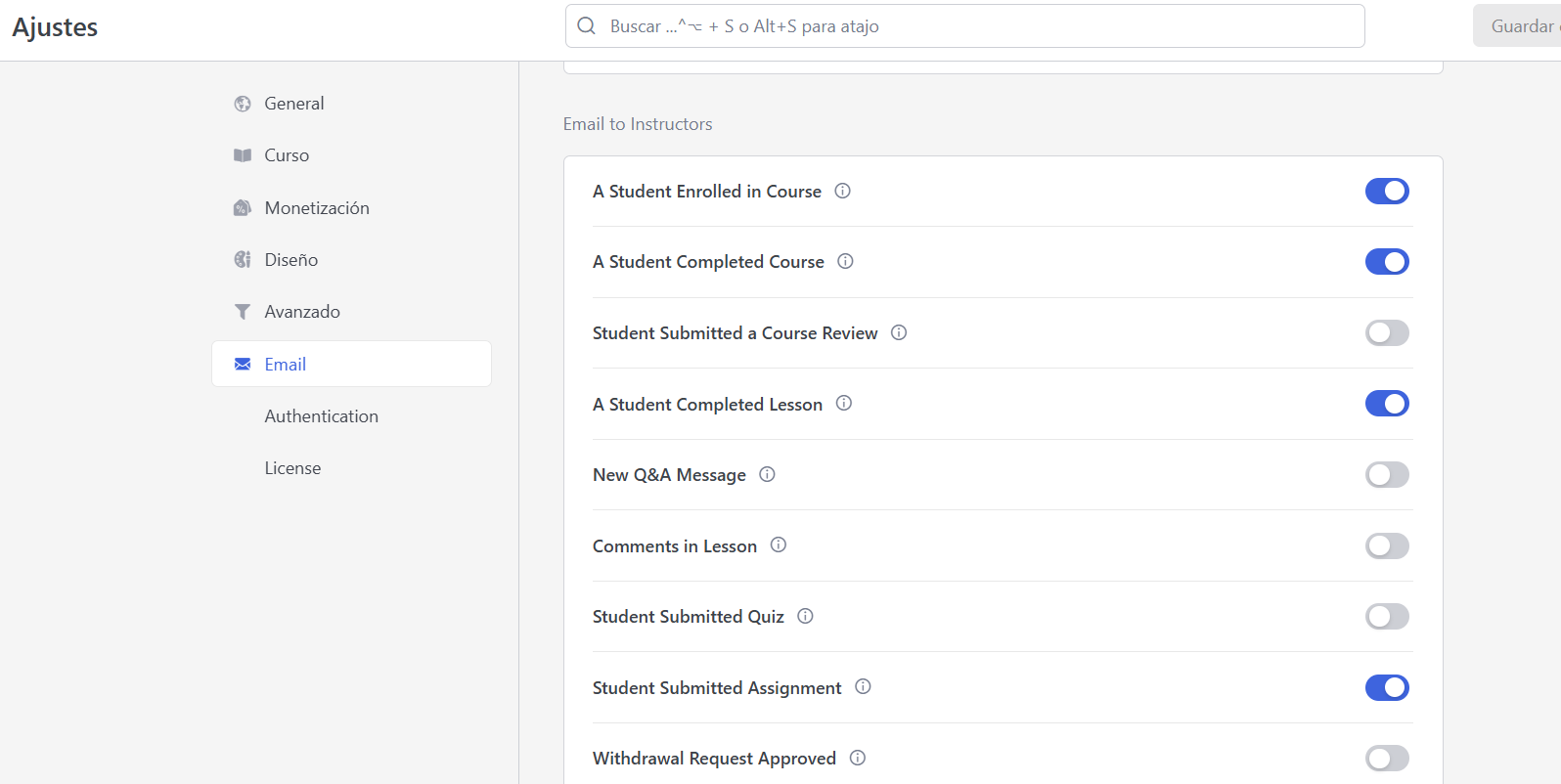 y en Ajustes de Tutor LMS Pro he activado que se envíe el correo al instructor (Captura "Captura Ajustes Email Tutor LMS PRO").