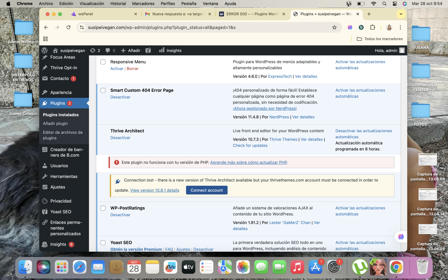 Tienes la versión 10.7.3 del plugin Thrive Architect, según vemos en la página del desarrollador esta no es la más reciente, puedes compartirnos cuna captura de este en el apartado de plugins? el trabaja con un sistema de conexión, entonces si no lo tienes conectado a su plataforma es posible que por eso esté mostrándote el aviso al guardar cambios.