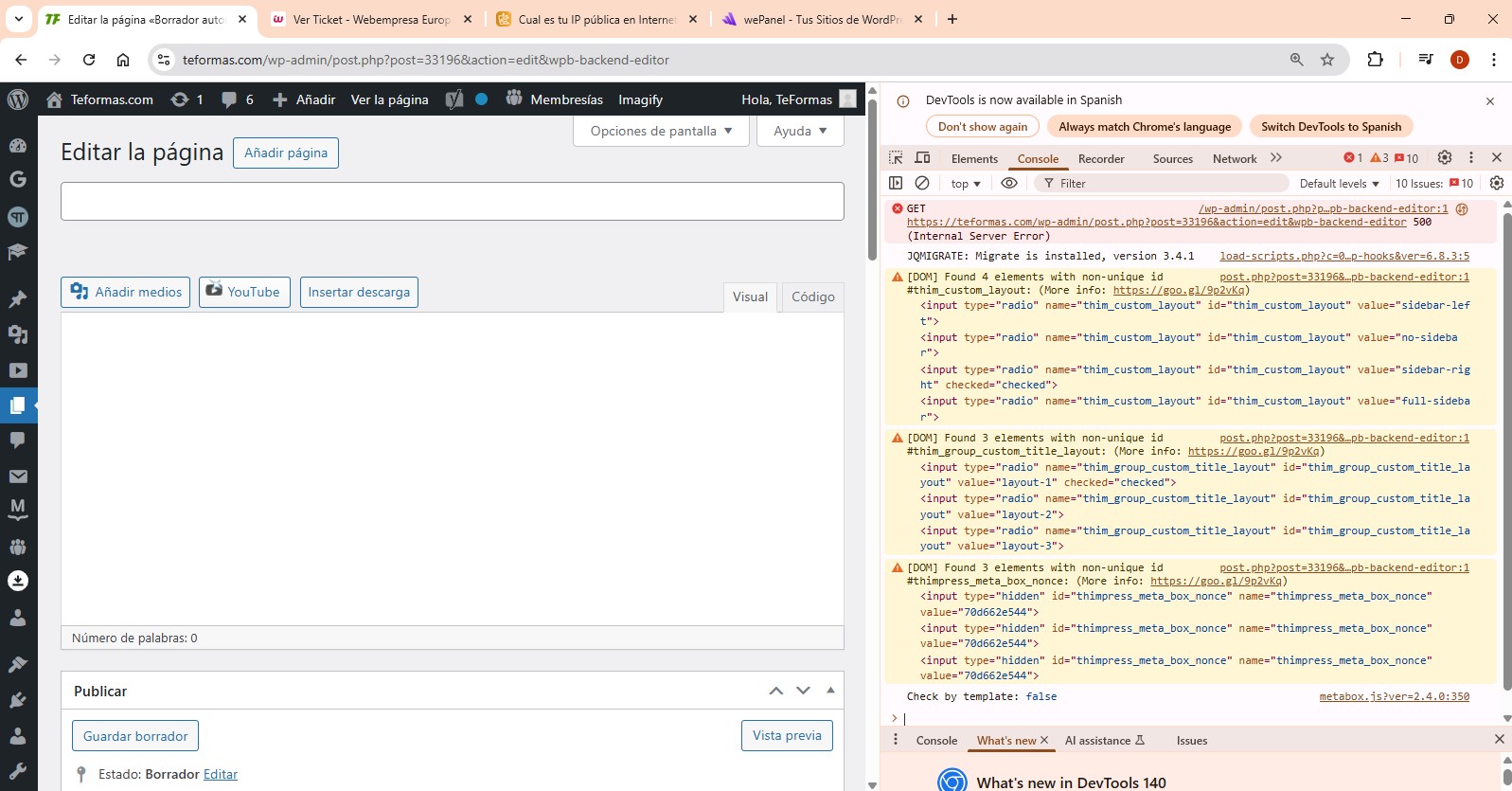 Desde hace un tiempo no puedo editar ninguna página con WPBakery Page Builder. Al intentar abrir el editor visual aparece un error 500 en la consola del navegador.