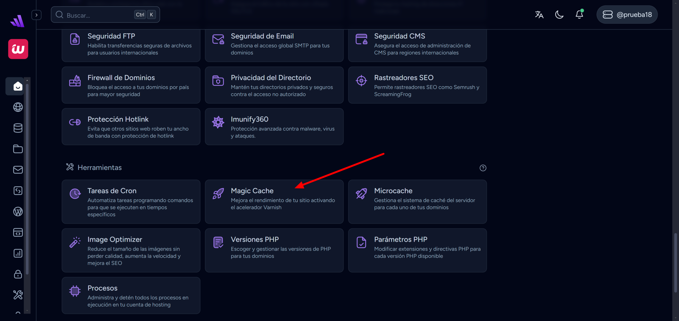 Para ello ingresa en tu wepanel y vas hasta magic cache: