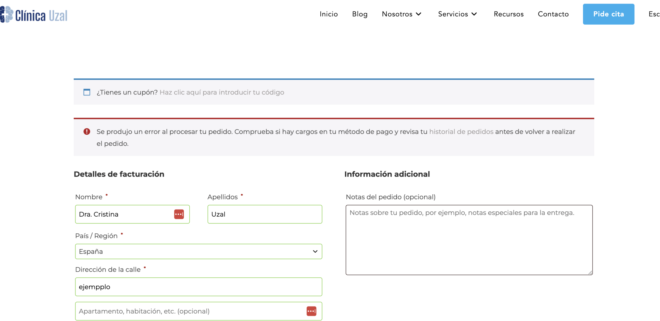Se produjo un error al procesar tu pedido. Comprueba si hay cargos en tu método de pago y revisa tu historial de pedidos antes de volver a realizar el pedido.