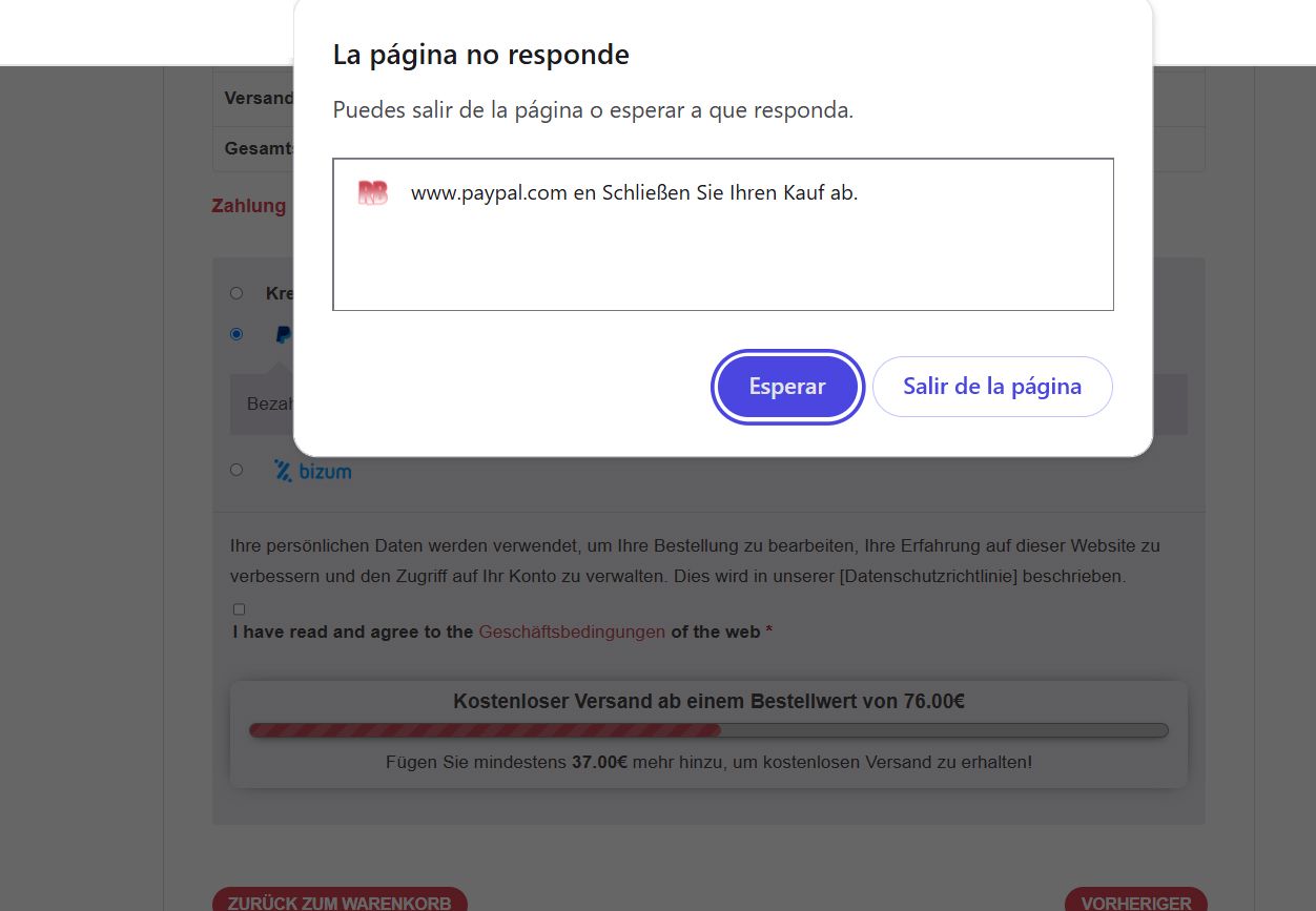 Buenas tardes, estoy valorando eliminar Stripe de mis webs y de momento he probado solo en el dominio retroboxes.de. He desactivado Stripe y he activado el plugin de Paypal "procesamiento avanzado de tarjetas". El único problema que le encuentro no es menor ya que además de un aviso de "esperar a que cargue o cerrar" realmente tarda más de un minuto en terminar de cargar y poder empezar a escribir los datos de la tarjeta (que mientras está cargando no lo permite)...