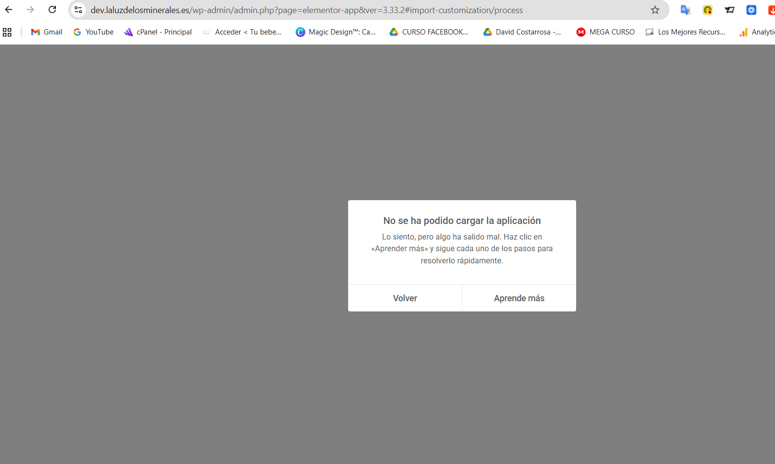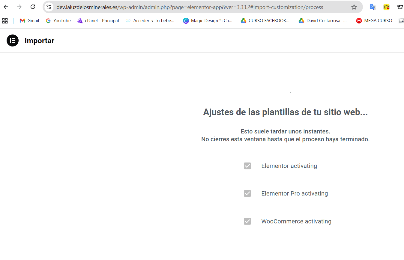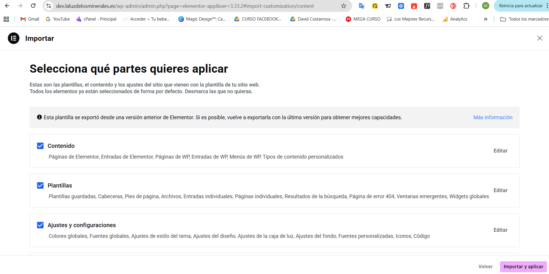 Indicar que en ambas tengo Elementor Pro original. Y este mismo proceso lo hice, cuando creé la página con otra plantilla .zip. También decir, por si sirve que en este caso fue sobre www.artesaniaymienrales.com, pero decidí cambiar el dominio, y de nuevo exporte de este último la web, y la subí a este de www.laluzdelosminerales.es