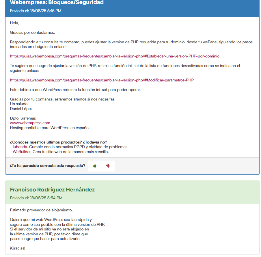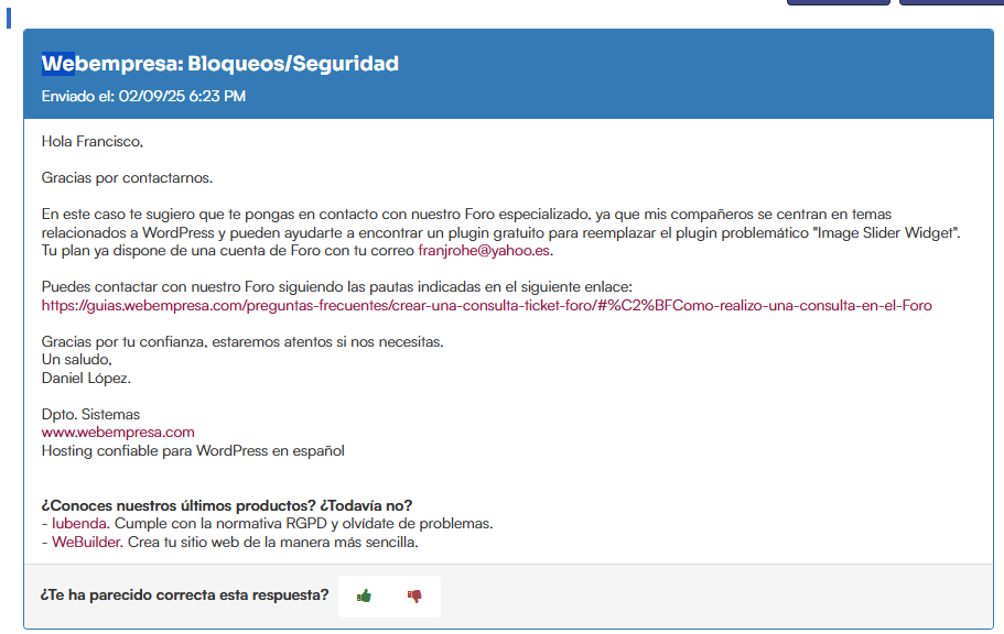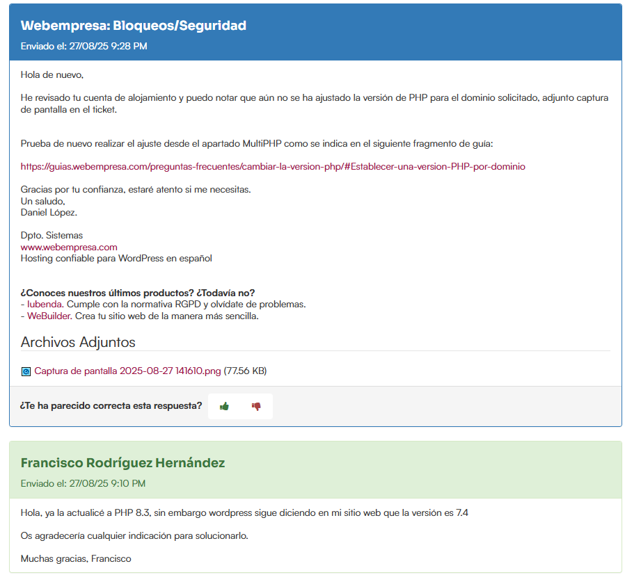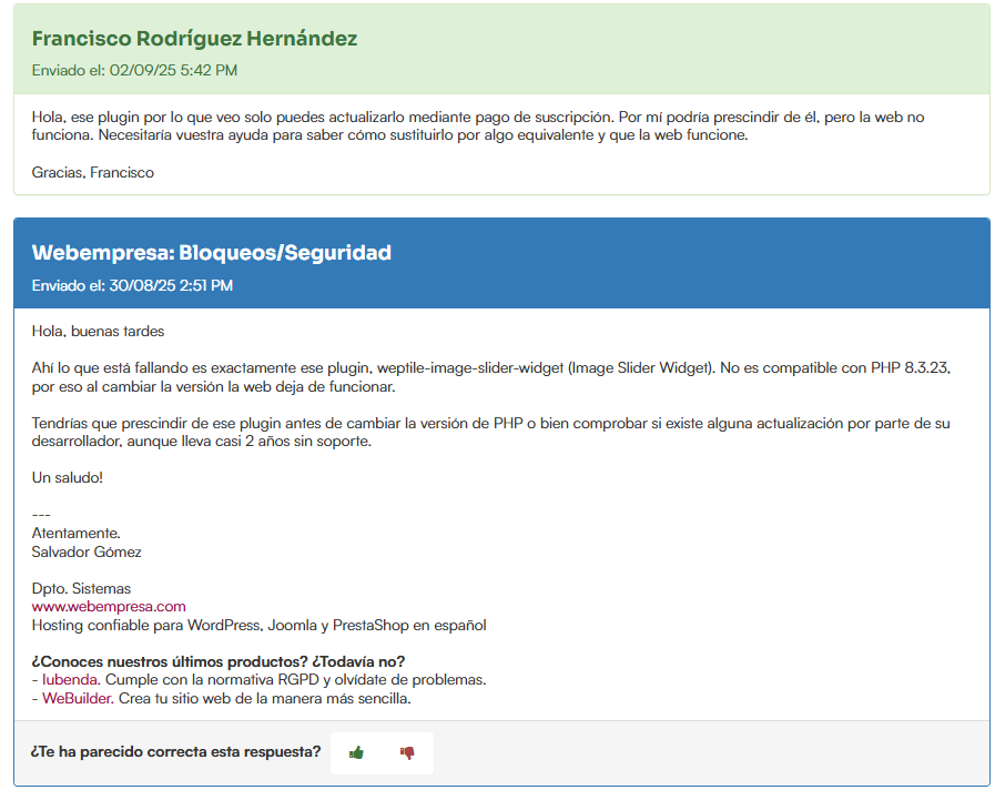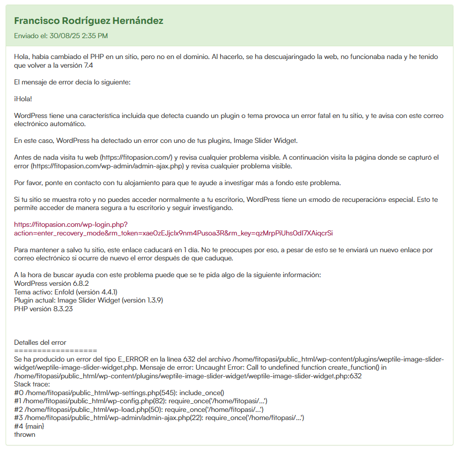 Mi sitio web indica un error crítico desde hace meses, relacionado con la actualización de PHP. Estoy usando la versión 7.4 y el aviso indica que debo actualizarla a 8.3. Cuando lo intento, la web deja de funcionar y parece relacionado con un plugin (Image Slider Widget). No sé como solucionar este asunto y cuando lo planteé en un ticket de webempresa me redirigen a este foro. Adjunto archivos con el pantallazo del problema y la conversación con webempresa. ¿Alguien puede ayudarme a resolver este problema?