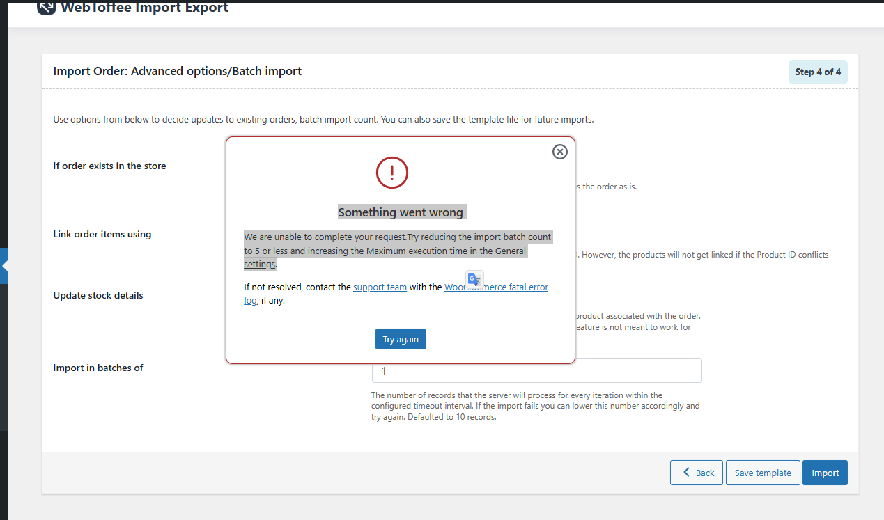 Estoy realizando una importación de pedidos con el plugin webtoffee Import Export. Ya he migrado los usuarios, pero los pedidos se me resisten. Al intentar importarlos me aparece el siguiente problema