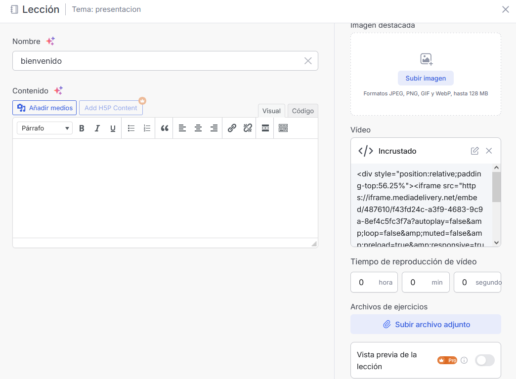 Entro en Tutor LMS, creo la lección, le doy a la opción de incrustrar el vídeo, pego el código de incrustración y le doy a guardar correctamente (ya comenté que este proceso no da problemas).