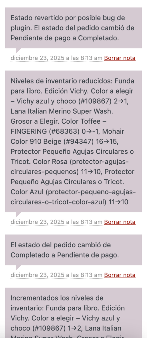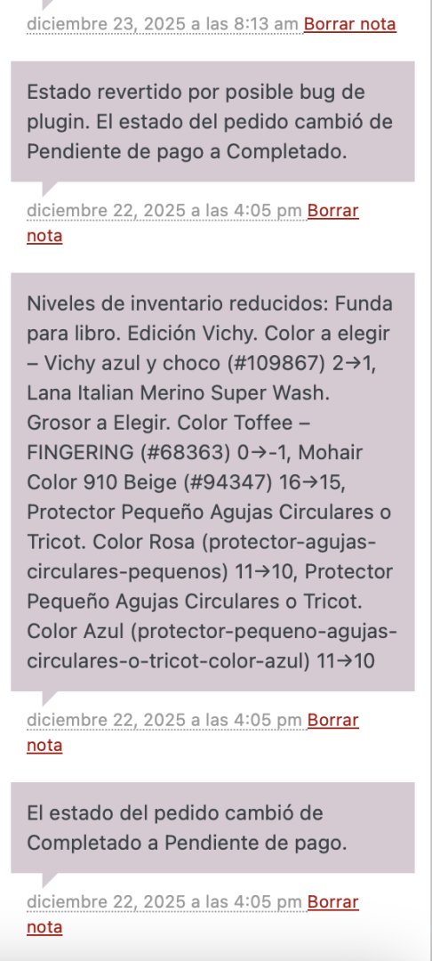 $order->update_status('completed', 'Estado revertido por posible bug de plugin.');