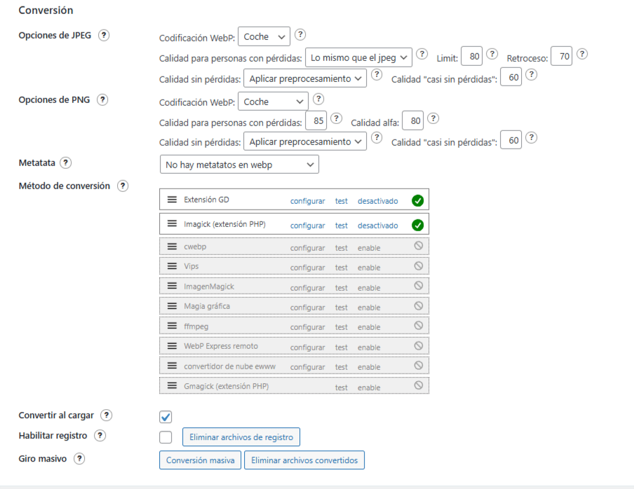Hola, entre varios ajustes que estoy llevando a cado para mejorar el rendimiento de mis webs, uno es convertir todas las imágenes a webp, he visto varios videos y artículos sobre varios plugins hasta que vi un artículo en el que pepe recomendaba este "WebP Express" pero no hablaba sobre la configuración, entonces después de instalarlo y probar varias configuraciones y crear las imágenes webp (un montón de horas) en una carpeta diferente, al final he borrado todas las imágenes porque voy a probar a crearlas mezcladas, he creado un ticket para que aumenten el tiempo para que el plugin pueda terminar de crear las imágenes.