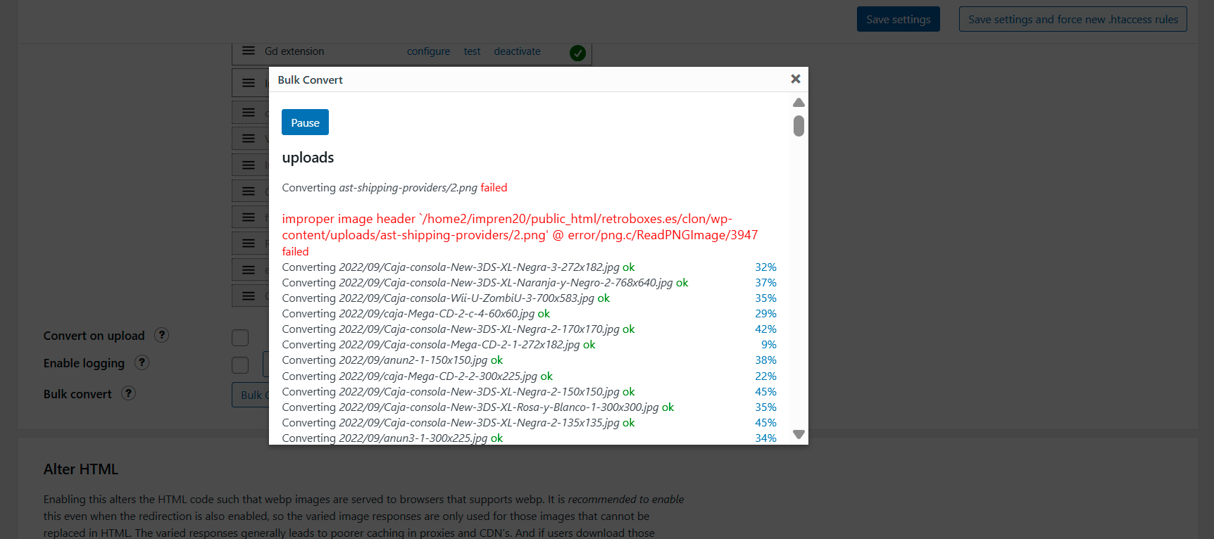Buenos dias la conversión se para cada 600 o 700 imágenes convertidas y yo le doy a convertir de nuevo y me dice la que quedan y comienzan pero esta ultima vez ha dado un mensaje de error en rojo que dice "improper image header `/home2/impren20/public_html/retroboxes.es/clon/wp-content/uploads/ast-shipping-providers/2.png' @ error/png.c/ReadPNGImage/3947 failed"