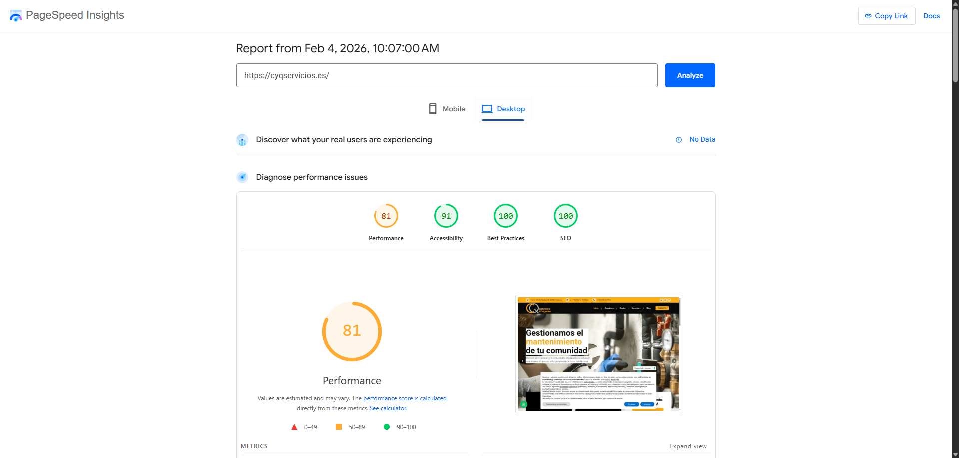 Desktop: 84 Rendimiento / 91 Accesibilidad / 100 Prácticas recomendadas / 100 SEO